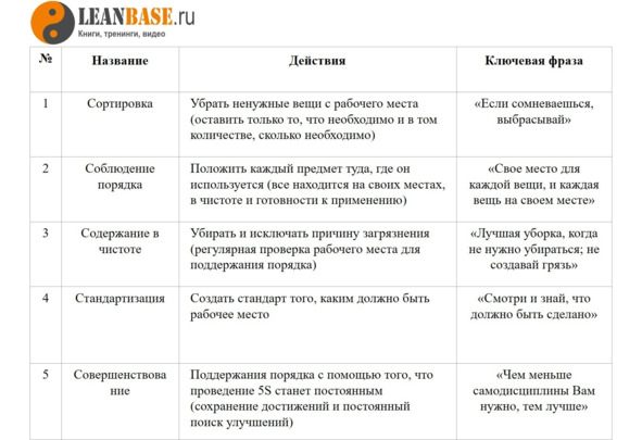 Метод устанавливает пять шагов, выполнение которых направлено на создание оптимальных условий выполнения операций, поддержание порядка, чистоты, аккуратности, экономию времени и энергии для повышения производительности, предотвращения несчастных случаев, снижения загрязнения окружающей среды.