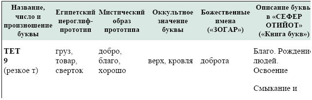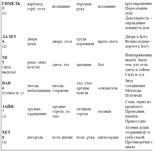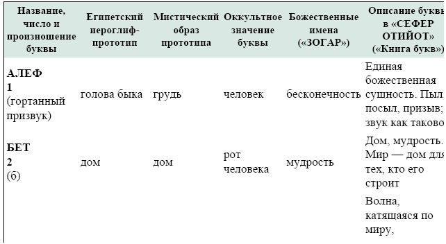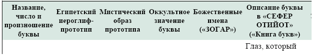 Все эти представления сведены в таблицу, раскрывающую значения букв еврейского алфавита в различных традициях и их соответствия старшим арканам Таро.