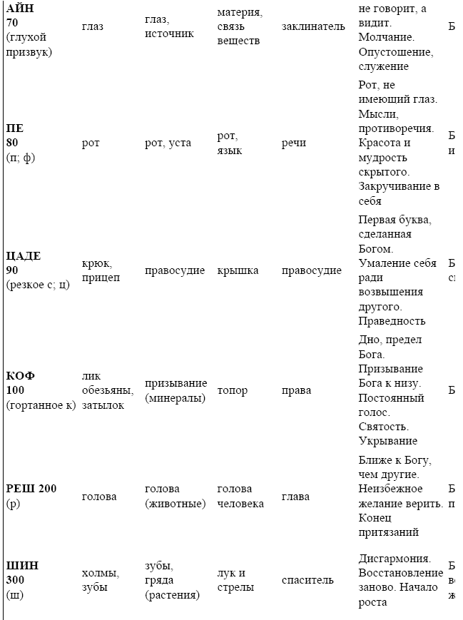 Но за каждой буквой иврита, работающей в общей системе понятий, тоже начинает читаться ее символический смысл. Он связывается с ее происхождением – объектом египетского иероглифа, который послужил прототипом этой буквы, – и подкрепляется тем мистическим представлением, которое существует в Каббале о звуке вообще. Абсолютный звук – голос Бога – существует изначально, наряду с его Духом и Словом. Основу материального мира составляет мир Сил (мир Гебуры, поэтому иногда возникновение букв связывается с Гебурой). Колебание звука в мире является проявленной силой, отражающей непроявленную идею Бога. Слово же есть сочетание и взаимодействие этих сил – способное породить объекты материального мира.