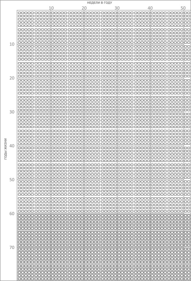 Посмотрите на этот замечательный прямоугольник. У вас перед глазами почти вся жизнь: 52 столбца в одной строке – это 52 недели в каждом году вашей жизни; 80 строк – это 80 лет вашей жизни. Что я предлагаю? Возьмите карандаш и для начала закрасьте прожитую часть жизни. Например, если вам 30 лет, то 30 полных строчек нужно зачеркнуть карандашом плюс зачеркнуть примерно то количество недель, которые вы уже прожили в текущем году. Серой заливкой отмечен возраст 60 лет. В этом возрасте многие выходят на пенсию либо приближаются к этому событию. Затем начните еженедельно зачеркивать очередную прожитую неделю, и, готов поспорить, вам расхочется откладывать на завтра вашу жизнь. Просто сделайте это, попробуйте.