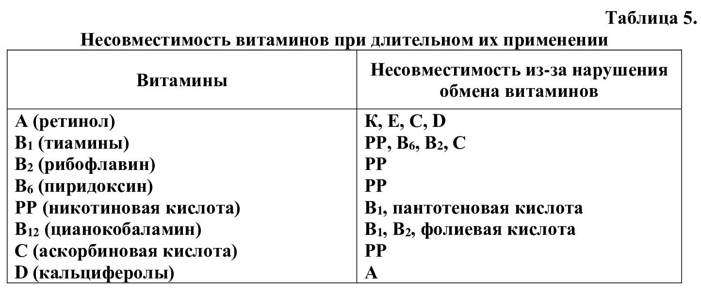 В силу своей высокой биологической активности витамины не безразличны для организма человека. Как и другие лекарственные вещества, они могут оказаться фармакологически несовместимыми между собой и с другими лекарственными веществами.