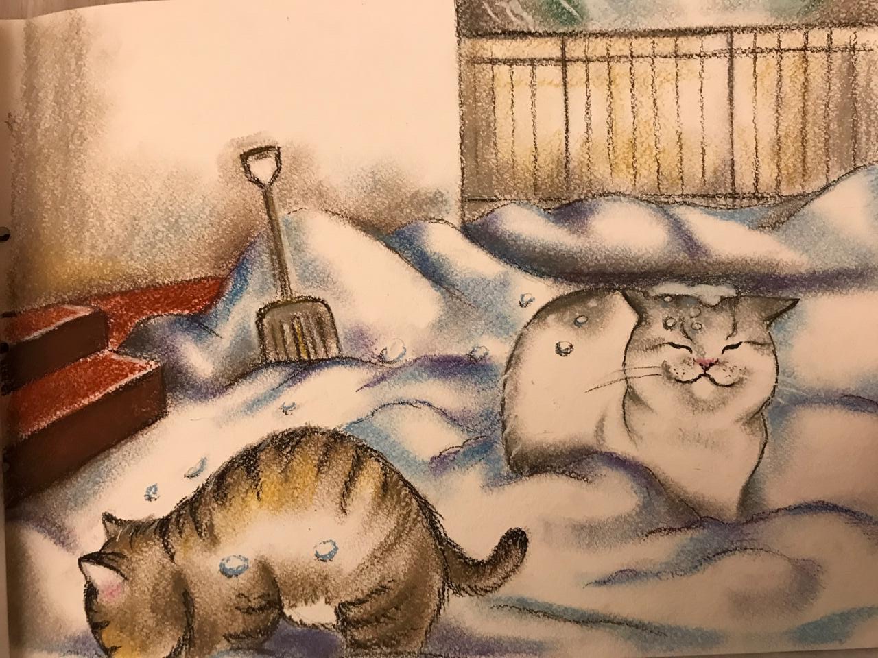–Кошки, вы пойдёте со мной разгребать снег?– спросил хозяин, дедушка Юра.