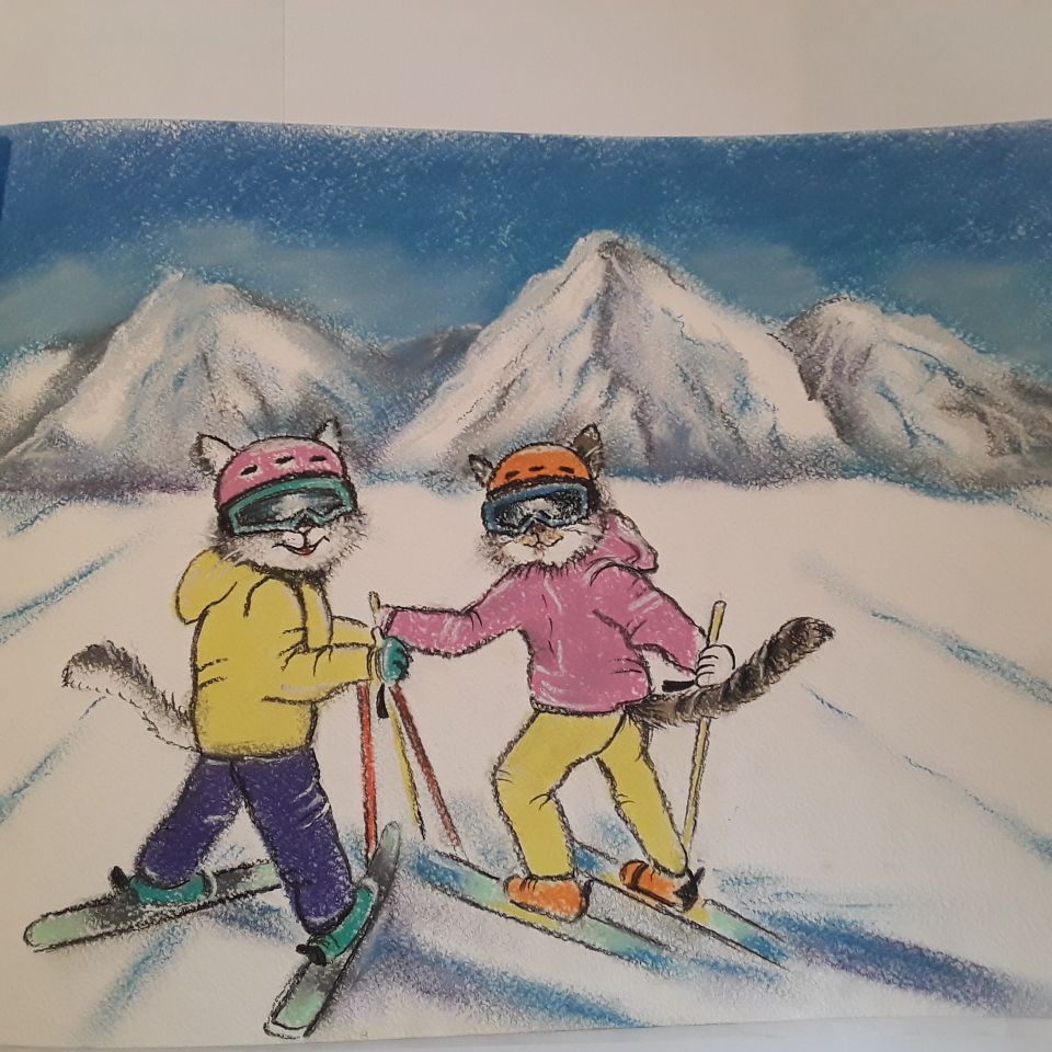 Кошкам дали лыжи, подобрали ботинки, шлемы, очки, ещё и наколенники надели, чтобы они не ударились, когда упадут. Кошки гордо выгнули спины, всем своим видом показывая, что они самые ловкие и не собираются падать.
