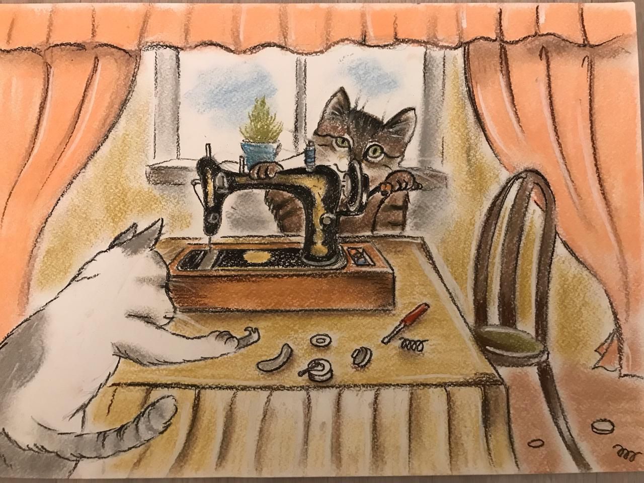 Вот бабушка закончила работу, сшила внучке юбочку для танцев. Когда бабушка ушла из дома в сад, кошки проследили за ней, и принялись за своё дело. Они нашли инструменты для ремонта машинки. И начали откручивать всякие винтики и блестящие детальки.