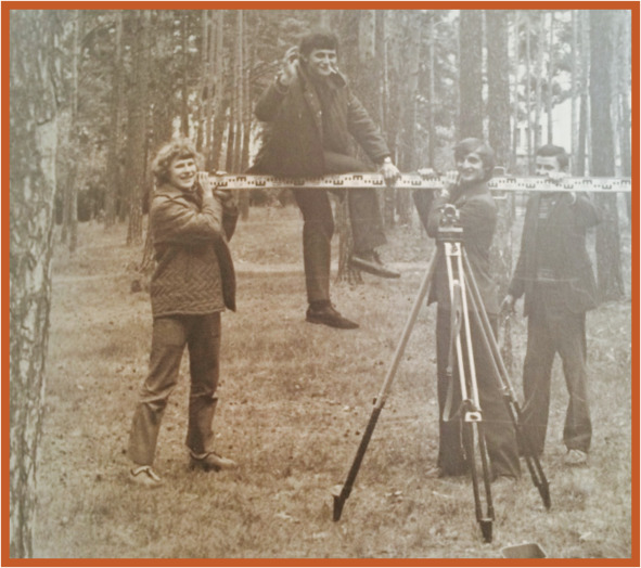 Геодезическая практика проходила в лесной зоне парка имени Гагарина, который располагался в непосредственной близости к нашему ВУЗу. Чем не отдых, совмещённый с занятиями. Нам нравились эти «прогулки» на свежем воздухе по просторам городского парка, что и отображается и на наших лицах.