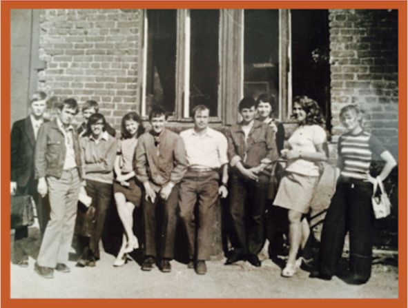 Возле лабораторного корпуса. Слева направо: Серёга Яровой, Юра Шуплецов, Женя Шенгальц, Володя Юрченко, Маринка Воронова, Саша Крылов, Преподаватель, я (как обычно с сигареткой), Ирина Хлебникова, Наталья Левина и в шикарной позе Ирина Шлейхер.