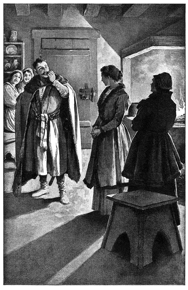 Но тут в дверях появилась чья-то высокая фигура в шубе и меховой шапке. Молодой мужчина шагнул на середину избы и, поняв, что находится в людской, звучным голосом, не снимая шапки, спросил: