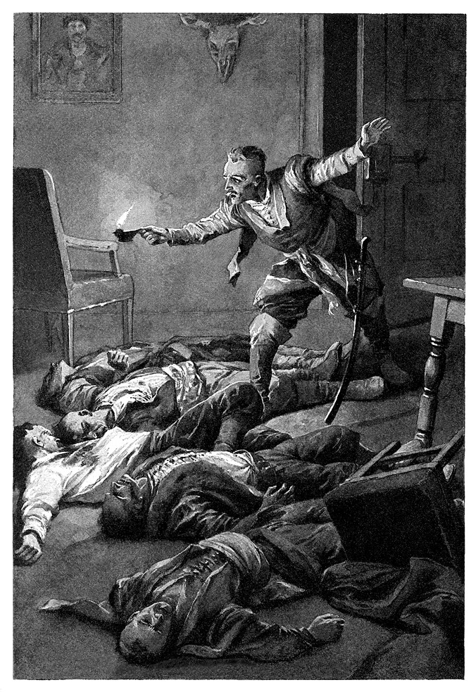 Тем временем вооруженные люди наполнили двор усадьбы, и в мгновение ока Бутрымы, Гостевичи, Домашевичи ворвались в дом. Увидев панну Александру, они остановились в столовом покое; стоя со свечой в руке у двери, ведущей в смежную комнату, она заслоняла от них эту дверь.