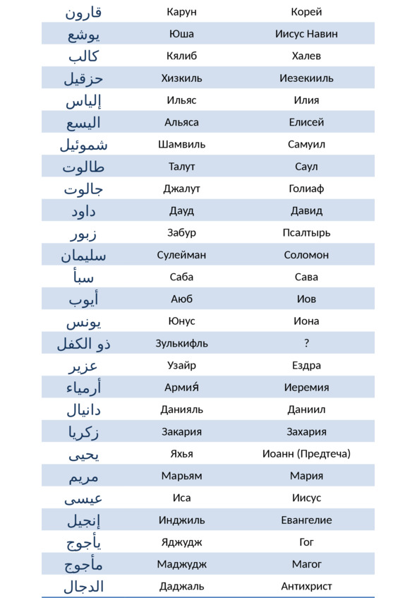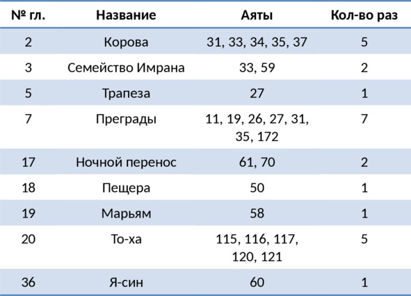 5. Ссылки на упоминания того или иного пророка в Коране даются в табличной форме.