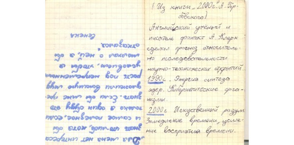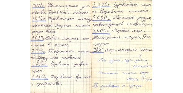 В приложенных иллюстрациях есть скан из моего блокнота с прогнозом будущих открытий. Этот блокнот относится к раннему отрочеству. И списанный прогноз подтверждает, что я родилась с сильной функцией «будущее» по темпористике и рассеянной по природе, так как функция «настоящее» стоит в моём темпористическом типе на последнем месте. Поэтому как только я в 1-м классе начала носить очки, они у меня начали «теряться», как у старушки. Покойный Сергей Иванович предлагал, чтобы облегчить поиски, прикрепить к ним приборчик, который бы откликался на хлопки.