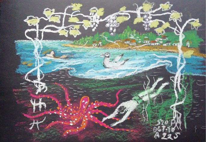 Я был поражен коротким и ясным ответом и нырнул вглубь. Я не закрывал глаз, чтобы насладиться видом таинственно мерцающей воды. Вынырнув, я увидел Джи уже вдалеке, плывущим к берегу. Когда, усталые, мы вернулись к своему месту на пляже, я обнаружил, что пакет с виноградом исчез.