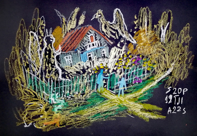 Пока я пытался разгадать, что имел в виду Джи, он открыл калитку и зашел на участок, заросший малинником и диким кустарником. Я ожидал увидеть большой каменный дом, которым мог быть, по моим представлениям, «космический перекресток», но меня ожидало большое разочарование. «Перекрестком бесконечностей» оказался маленький деревянный домик с мансардой, стоящий среди крыжовника и густой крапивы, и покосившаяся деревянная кухня в заброшенном яблоневом саду. Золотистые бабочки-однодневки кружили над редкими цветами, выглядывающими из буйно разросшейся травы.