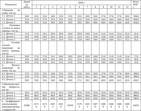 План выпуска продукции (ВП) определяется по формуле ВП = П + ОК – ОН, где П – объем продаж продукции, ОК – остатки на конец месяца, ОН – остатки на начало месяца. Например, объем выпуска детали 1 в третьем месяце составит 24,8 тыс. ед. (24,0 +20,0—19,2).