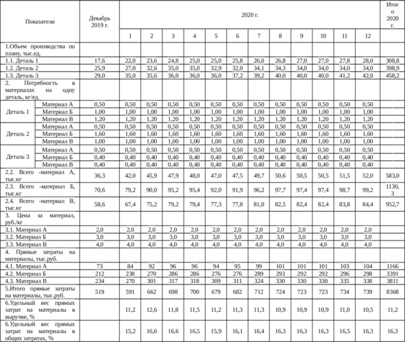 При формировании бюджета прямых затрат на основные материалы также определяются такие аналитические показатели, как их удельный вес в выручке и общих затратах.