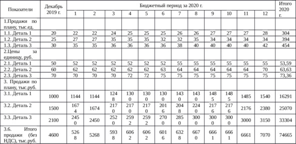 В бюджете продаж указана реализация трех видов продукции (деталь 1, деталь 2, деталь 3) в течение планового периода (1 год). План дан как в натуральном, так и стоимостном выражении. Для упрощения модели все расчеты проведены без НДС.