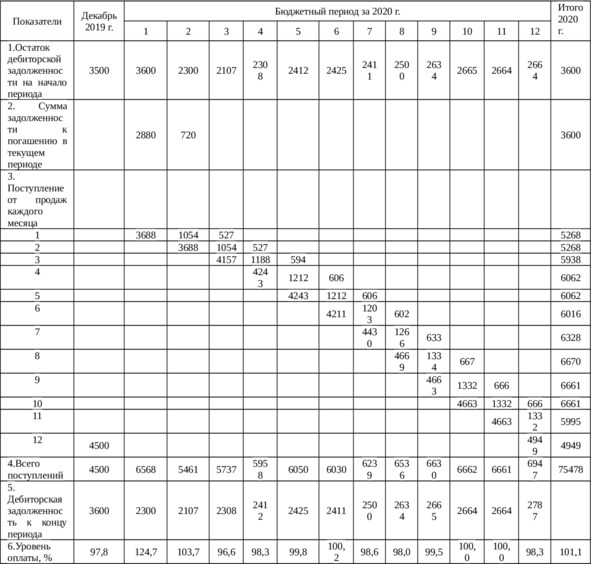 За весь год уровень оплаты составит 101,1%. Следовательно, объем поступлений денежных средств больше выручки, что отразится на снижении дебиторской задолженности с 3600 до 2787 тыс. руб.