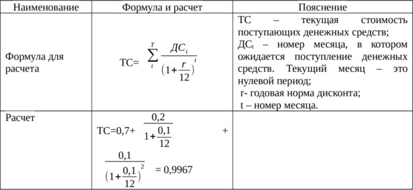 Часто менеджерам по продажам приходится решать прикладные задачи, связанные со способом оплаты. В нашем примере 70% поставленной продукции оплачивается сразу, 20% – на следующий месяц, 10% – через на второй месяц. Покупатель может оплатить сразу всю сумму, но запросить определенную скидку, например, 2%. В таком случае текущая стоимость полученных средств на один рубль составит 0,98 руб. Её нужно сравнить с текущей стоимостью потока денежных средств с учетом рассрочки, что оценивается на основе метода дисконтирования. Расчет текущей стоимости денежных средств с учетом рассрочки и стоимости заемных средств в размере 10% представлен в таблице 3.3.