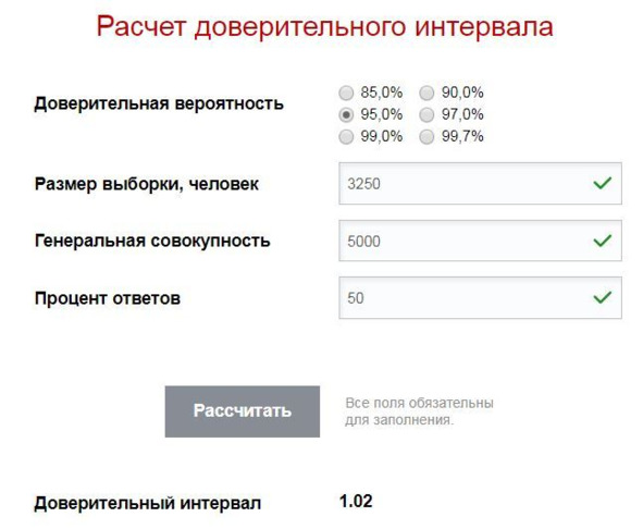 Например, если в компании 5.000 сотрудников, а сдали анкеты только 3.250, то при доверительной вероятности 95% доверительный интервал будет ±1,02%. Считается это также в онлайн калькуляторах. Пример, как выглядят такие онлайн калькуляторы в сети Интернет на рис.10.1: