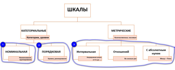 Статисты придумали разные типы шкал (см. рис.) но их в целом можно объединить в три основных типа, которые в книге приводятся в порядке возрастания информативности: