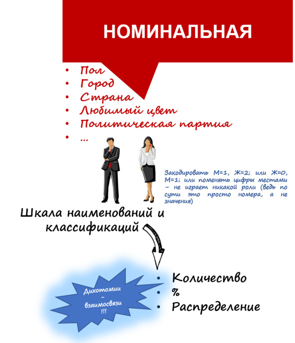 Т.е., эта шкала всего лишь определяет принадлежность наблюдения, случая или объекта к какой-то группе и позволяет классифицировать объекты. Тут мы можем посчитать только количество объектов в группе (количество или % мужчин и женщин в нашей выборке; количество людей из разных стран или профессий).