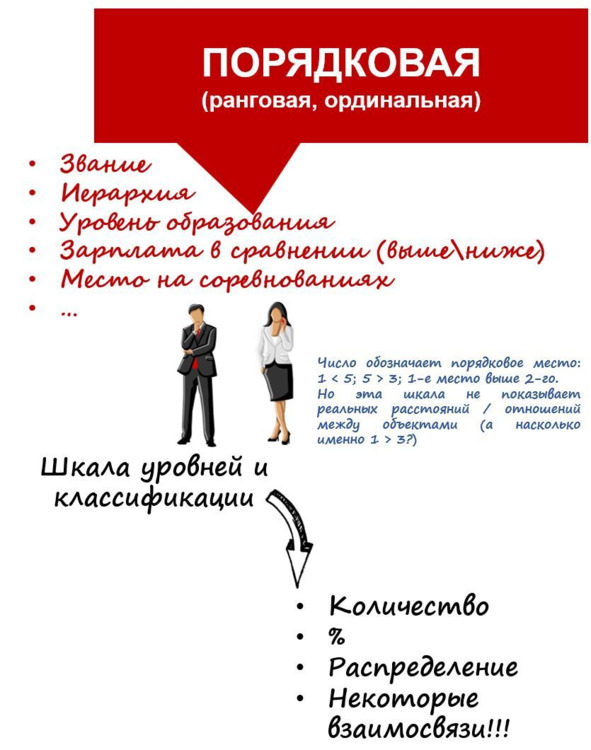 Еще ее называют ординальная (от order – c англ. порядок). Например, воинское звание, место в организационной иерархии или уровень образования. Тут закладывается степень проявления какого-то свойства между объектами, но непонятна ни его точность, ни расстояния между ними.