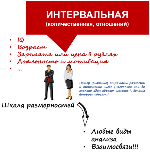 Оговорюсь, что количественные (метрические) шкалы могут выглядеть по-разному: есть с отрицательными значениями, есть с абсолютным нулем (например, возраст) есть те, которые в принципе не начинаются с нуля (например, IQ). Аналитики в разговорах, статьях, литературе их могут именовать по-разному (например, интервальная, шкала масштаба или шкала отношений с абсолютным нулем…) – но, по сути, все они с точки зрения использования методов аналитического инструментария одинаковы.