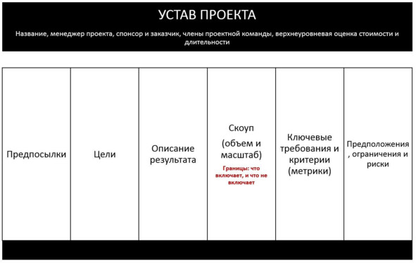 · Границы проекта – и что входит, и обязательно что точно ни при каких раскладах в проект не входит. Второе даже важнее чем первое.