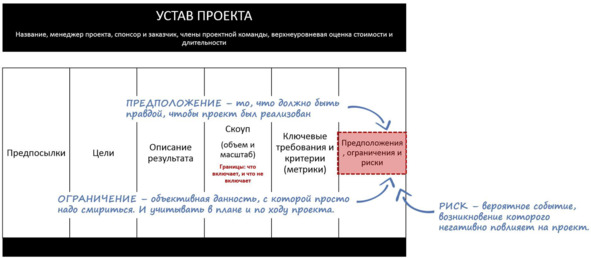 · Любые предположения, ограничения и риски. Тут остановлюсь поподробнее, потому что из моего опыта даже опытные менеджеры проектов опускают эти моменты (рис. 1.7).