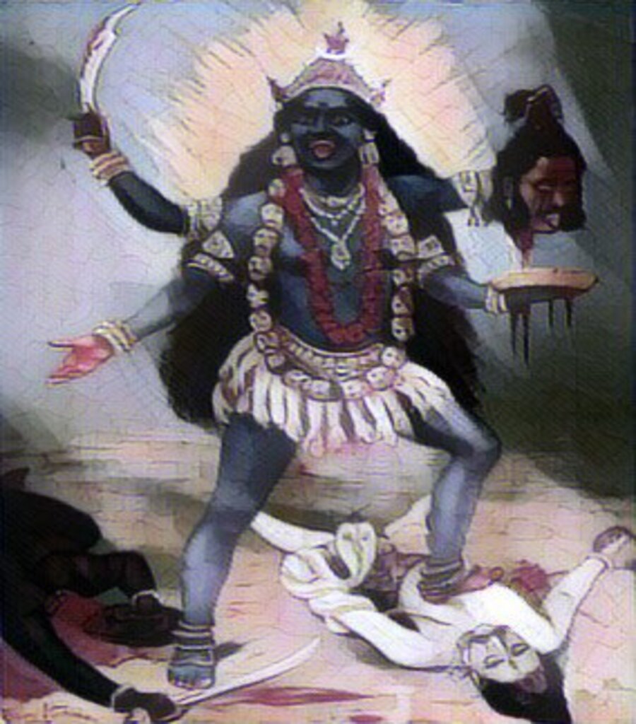 Раны в подмышечных областях являются посмертными и образовались в результате прокалывания тела жертвы металлическим прутом. Сделано это, скорее всего, с целью создания представленной перед нами композиции. Трупные пятна на нижних конечностях свидетельствуют о том, что непосредственно после смерти труп был подвешен в вертикальном положении и держался в таком состоянии до прибытия следственно-оперативной группы. Используемая краска – обычная акриловая, узлы на шнуре и повязке также ничем не примечательны. Участковым уполномоченным поручено провести обходы магазинов с целью выяснения происхождения манекена, меча, пластиковых рук кукол, черепов и тому подобного. Сама поза трупа имитирует позу из книги Николая Петрова "Смерть на холсте". Согласно моему краткому просмотру информации в интернете, книга рассказывает историю серийного убийцы – психически неуравновешенного индуса-художника. Художник изображал сюжеты из индийской мифологии. Для работы над картинами ему были нужны натурщики. С целью изображения индуистских богов он убивал людей, делал из них фигуры и рисовал их. История посвящена богине "Кали". Согласно Википедии, "Кали – богиня в индуизме, выступающая как яростная форма Шакти и появляющаяся в мифологии как уничтожитель демонов. Ее гнев настолько ужасен, что угрожает существованию мира, поэтому в мифологии особая тема – усмирение Кали. Кали также защитница богов и дарующая освобождение. Последователи тантрического шактизма и различных тантрических сект поклоняются ей, как высшей реальности или Брахману. Кали является объектом поклонения множества культов и религиозных течений. Часто Кали изображается стоящей или танцующей на своем супруге, боге Шиве". Следовательно, манекен, на который опираются ноги трупа, представляет из себя бога Шиву.