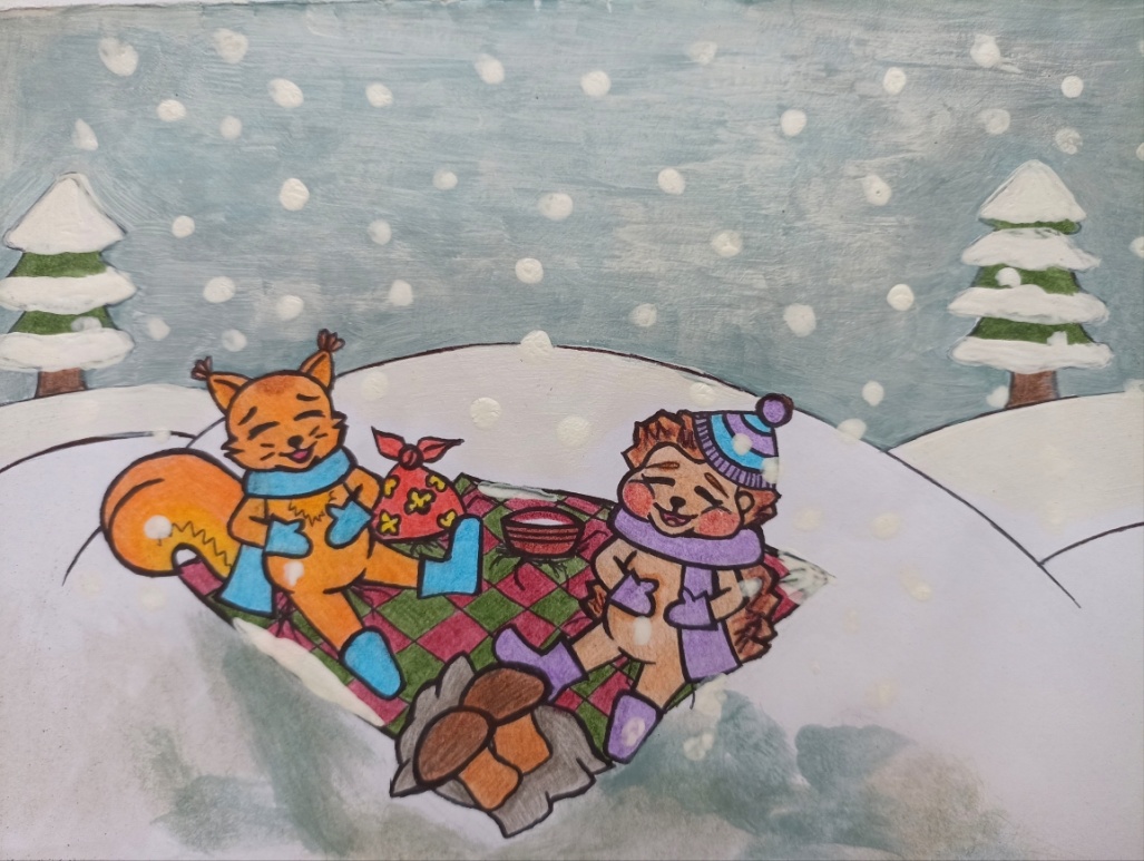 Друзья постелили одеяльце на снег и стали доставать угощения. Ёжик знал, что бельчонок любит вяленые яблочки. Поэтому захватил их побольше. Они наслаждались вкусом молока, похрустывая сушёными грибами и орешками. А снег все летел и летел. Снежинки падали в молоко и таяли. Друзья вспоминали летние дни и осенние забавы. От радости они хохотали. Антошка был особенно счастлив. Перед ним была Зима…
