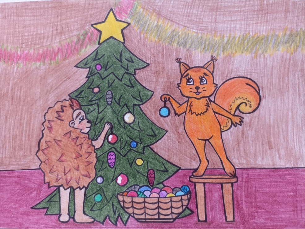 Тропинка привела их на большую поляну. Летом на ней приветливо кивали золотые личики ромашек, бусинками была рассыпана земляника. Сейчас здесь тоже было очень красиво! Но в ладоши хлопали не лопухи, а могучие сосны своими мохнатыми, пушистыми рукавицами, осыпая снегом поляну. Среди сугробов стояла высокая нарядная ёлка. Маленькие и большие жители леса водили вокруг неё хоровод. Антошка и Капитошка сразу пустились в эту новогоднюю карусель.