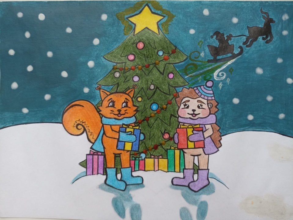 – Северный олень снова помчался на поляну, где была новогодняя ёлка. Зверята катались по мягкому снегу, кидались снежными комочками и бегали наперегонки.