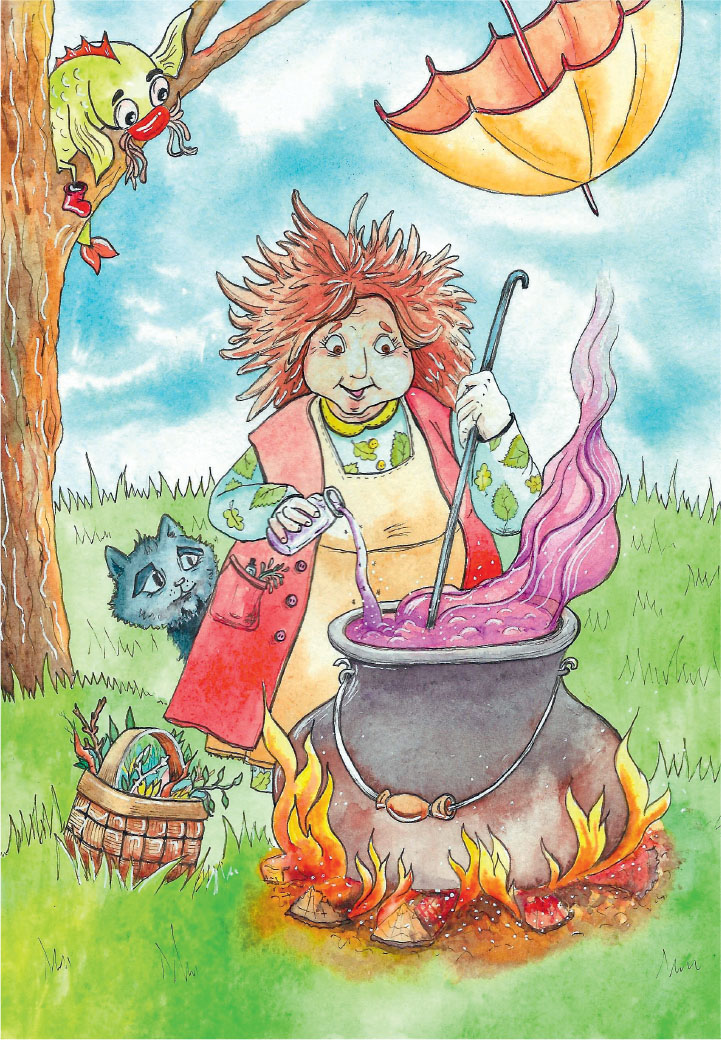 Так вот, баба Юа варила зелье по рецепту из старой книги, найденной на чердаке, чтобы исправить ситуацию с погодой. Рыба деловито прошлёпала мимо удивлённой бабуси, неся во рту червей, и стала карабкаться на дерево.