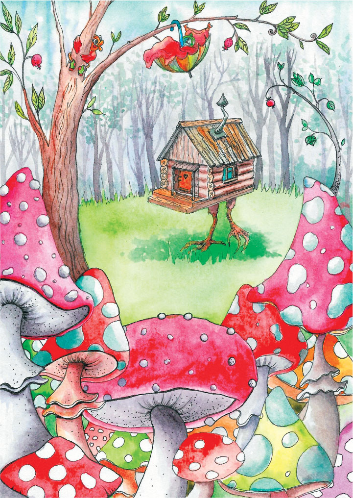 Выйдя на крыльцо, Юа потеряла дар речи. Во-первых, крыльцо было теперь в двух метрах от земли. Во-вторых, окружающий избушку лес выглядел по-другому. Вокруг росли мухоморы. Они были разные. Одни как зонты, другие как кокетливые шляпы, третьи вовсе как клубочки на ножках. Размеры тоже были на любой вкус. От огромных, в человеческий рост, до обычных, еле заметных в траве. Расцветки поражали воображение. Мухоморы были красные, оранжевые, бордовые. С точечками на шляпках или с крупными горошинами. Даже белые и зелёные попадались.