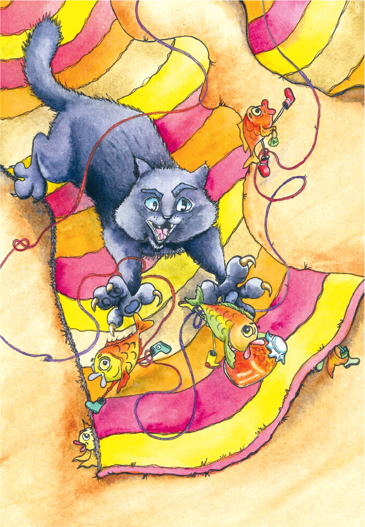 Звуки замерли. Кот вдруг материализовался из воздуха. Он сидел на краю кровати и сосредоточенно смотрел в то место, где только что половик собрался в гармошку. Потом раздалась дробь топающих ножек. Невидимые топотунчики спешили покинуть избу. Скрипнув, открылась входная дверь. И тут раздался треск, будто что-то порвалось, и виновники погрома вдруг предстали во всей красе! Толпа рыб в цветных сапожках торопилась на выход. За каждой волочился обрывок какой-то не то нитки, не то верёвки. Рыбы толкались и спотыкались друг о друга.