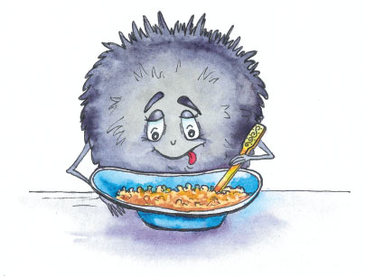 Спустя некоторое время они уже сидели за столом и завтракали. На завтрак у них была манная каша. И Кот и хозяйка её обожали. Кот любил с маслицем, Ягуся с вареньем. Домовушки уплетали за обе щёки и с маслицем, и с вареньем, и с сахаром, и просто так, с добавкой. А рыба ела варенье без каши.