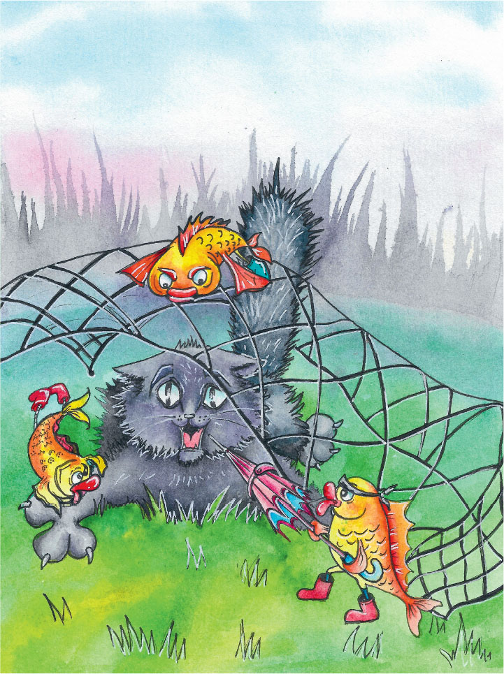 – Меня разбудил странный шорох с улицы. Шуршали в кустах. Решил разобраться с подозрительными шуршунчиками. Прыгнул я в кусты – а там сеть! Эту сеть рыбы поставили специально для меня. Оказывается, если рыба смогла выбраться хоть один раз из сети и удрать от рыбака, то она сама сможет ставить сети. Вот они и поставили. Взамен на мою свободу они хотели волшебную палочку. Я им говорю: «Нет у нас волшебной палочки!» – а они мне: «Врёшь! Давай сами проверим!» Только ничего у них не вышло – порог высокий у нашей избы, не смогли залезть. Поэтому без меня им никак. Я их, конечно, застращал, что если ты увидишь, то зажаришь и съешь, но они…