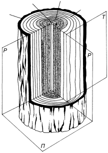 Рис. 1. Разрезы ствола дерева: П – поперечный, Р – радиальный, Т – тангенциальный