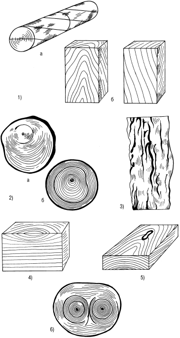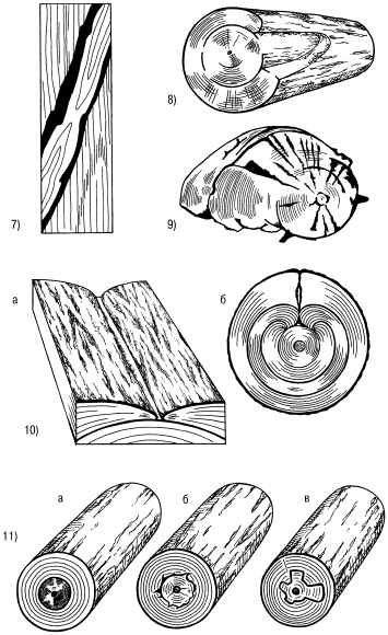 Рис. 3. Пороки строения древесины: 1 – разновидности наклона волокон: а – тангенциальный наклон в круглых лесоматериалах; б – местная; 2 – крень: а – сплошная; б – местная; 3 – волокнистая свилеватость у березы; 4 – завиток односторонний; 5 – кармашек; 6 – двойная сердцевина в стволе сосны; 7 – пасынок; 8 – сухобокость; 9 – рак сосны; 10 – прорость: а – открытая; б – закрытая; 11 – ложное ядро: а – округлое; б – звездчатое; в – лопастное