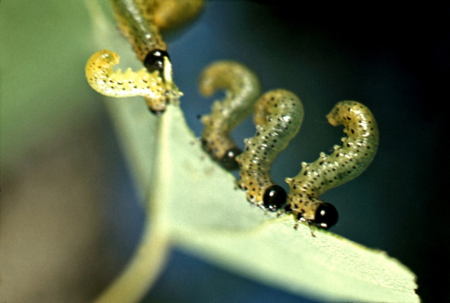 В нескольких сотнях метров от Уютной поляны вскоре была открыта еще одна, правда более обжитая, с двумя черными кругами кострищ. Здесь на молодом осиновом дереве был припасен для меня подарок – дружное семейство ложногусениц, личинок осинового пилильщика. Они выстроились вдоль края листа ровной шеренгой и работали челюстями с таким энтузиазмом, что лист исчезал на глазах. Завидев меня, они, как по команде, подняли вверх зады (такова их поза угрозы) и в таком виде продолжали трудиться перед объективом фотоаппарата. Время от времени из верхних концов вопросительных знаков появлялись и падали вниз темные комочки. Пронизанные солнечными лучами виноградно-прозрачные зеленовато-медовые ложногусеницы с черными лакированными головками были чрезвычайно красивы на голубом фоне неба. Разумеется, я потратил на них целую пленку.