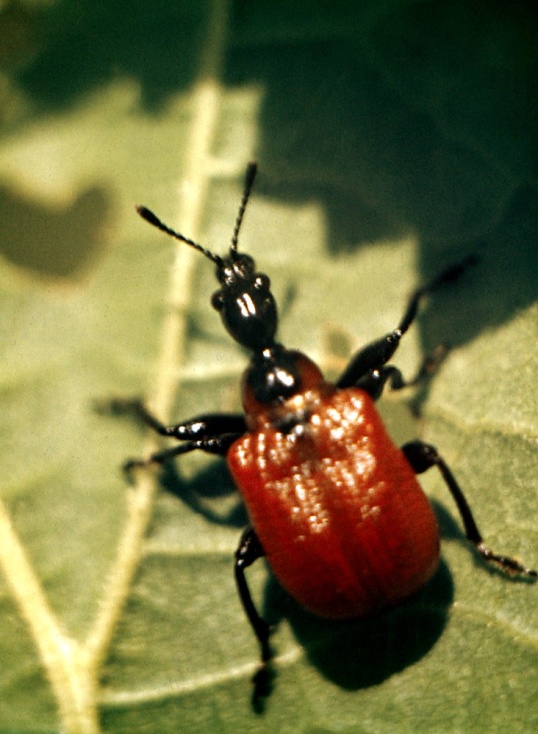 Он очень красив, несмотря на малые свои размеры. Головка на длинной шее-груди, брюшко, ножки глянцево-черные. А надкрылья ярко-красные, да к тому же еще, словно гофрированные и покрытые лаком. Удивительно изящное это существо, похожее на заводную игрушку размером всего 6–8 миллиметров, обладает немалыми способностями. Самка так умело надрезает лист орешника, что надрезанная часть листа, не умирая, становится совсем мягкой, настолько поддающейся «обработке», что крошечная самка хотя и с огромным трудом, но сворачивает из такого листика трубочку (откуда и название «трубковерт»), в которую откладывает потом одно маленькое красное яичко. И стол и дом для «ребенка» готов!