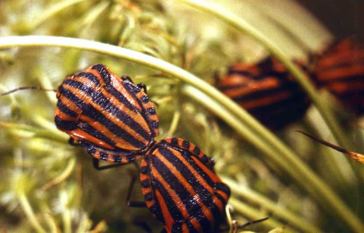 Что-то желтое впереди?.. Ферула! Не только наверху, а уже и здесь, на полпути, авангард сверху. И эремурус тут же, лиловые свечи. Уф, добрались до ферулы, можно передохнуть. Каждая веточка большого, в рост человека, растения усеяна крошечными зеленовато-желтыми цветочками, сквозящая полупрозрачная желтизна, нечто среднее между таволгой, зонтичными и соцветиями винограда. Нежный слабый парфюмерный аромат и множество жужжащих, ползающих, застывших неподвижно блаженствующих насекомых. И – к особой моей радости – итальянские клопы, полосатые, раскрашенные с примитивным легкомыслием: полоса красная, полоса черная, полоса красная, полоса черная. Этакий матрасно-носочный колер. Почему итальянские? Наверное, потому, что открыли их впервые в Италии.