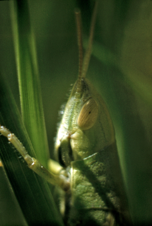 Из многочисленных прямокрылых (в отряд прямокрылых входят кузнечики, кобылки, сверчки, медведки и саранчовые) меня особенно растрогала тропидопола – небольшое саранчовое, длиной сантиметра четыре. Она сидела на злаковом стебле, бережно охватив его ножками, и, передвигая ножки, поворачивалась вокруг него, чтобы спрятаться за ним, когда я к ней приближался. Взгляд у нее был трогательно удивленный. Ни дать ни взять заколдованная красавица, до сих пор не понимающая, как это она оказалась в таком густом, дремучем лесу. При ближайшем рассмотрении большие овальные глаза ее оказались деревянными полированными брошками таллинского производства. Отчетливо был виден рисунок древесных волокон. Похоже – карельская береза…