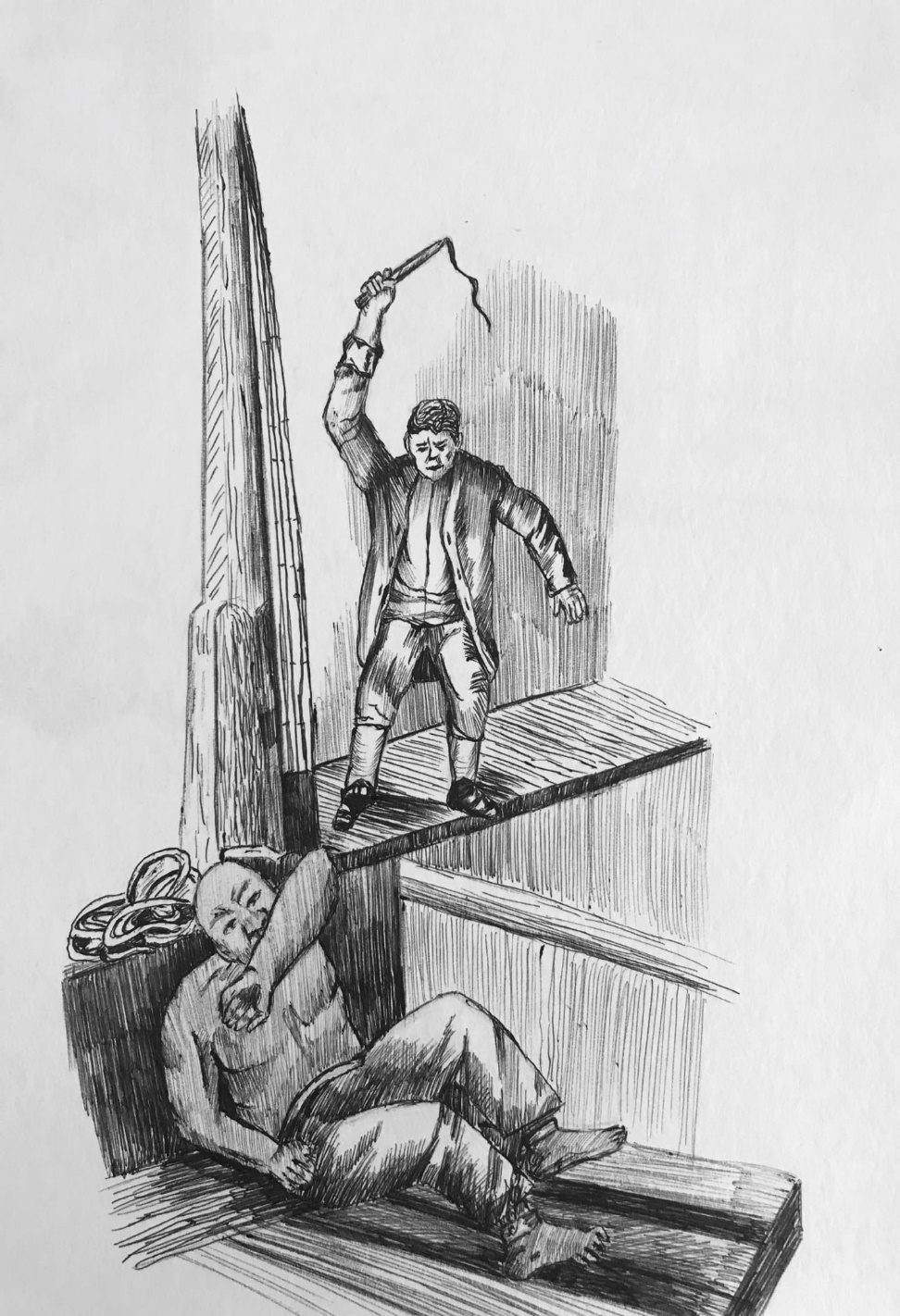 После разговора англичане разошлись, а я, дядюшка и норвежец отправились в сторону верфи, где стоял «Гефест». Дядя хотел еще раз убедиться в правильности установки двигателя. Подходя к месту назначения, Ларс Нансен заметил следующую картину: возле берега стояло американское торговое судно, на палубе которого происходил конфликт. По всей видимости, капитан барка разгневался на одного из своих подчиненных и со всей силы хлестал беднягу шпицрутеном. Подойдя ближе, мы заметили, что это был огромный чернокожий мужчина, закованный в цепи, и он сидел, закрыв голову руками, принимая удары. Эта картина заставила Ларса Нансена подняться на борт барка.