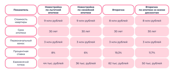 Несложно заметить, что сегодня условия ипотеки, предоставляемой для приобретения жилья на вторичном рынке, менее выгоды по сравнению с ипотечными программами, действующими в отношении квартир в новостройках. Так, ставка по льготной ипотеке с господдержкой не превышала 8% годовых, по семейной ипотеке – 6%, в то время как базовая программа ипотеки для вторички предусматривает минимальную ставку округленно 25% годовых. Этот факт делает приобретение квартиры от застройщика привлекательнее, даже несмотря на более высокий ценник на квадратный метр ее площади. Меньший размер процентной ставки по ипотечной программе выгодно для заемщика отражается на размере ежемесячного платежа и общих расходах, понесенных на приобретение квартиры.