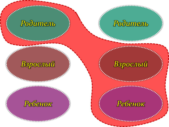 Симбиоз возникает тогда, когда два и более человека ведут себя так, как будто между ними образуется одна целостная личность, состоящая из трех Эго-состояний. Эта взаимосвязь структурно характеризуется тем, что ни один индивид не развивает полный комплект Эго-состояний. Так, один человек может иметь Эго-состояние Родителя и Взрослого, а второй – состояние Ребенка, и таким образом, дополняя друг друга, они образуют одну личность (рисунок).