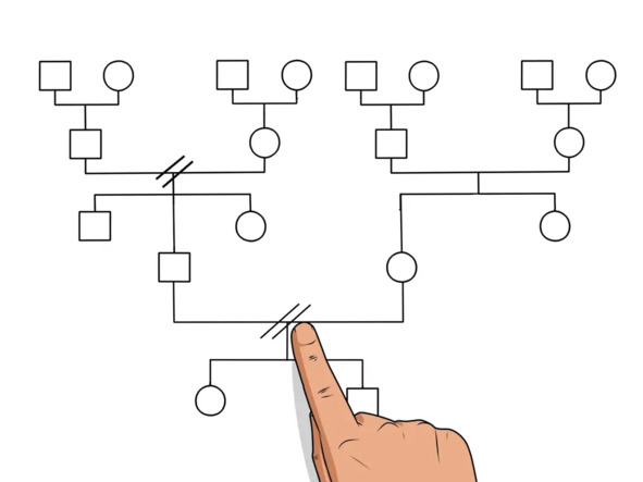 2. Генограмма. Такой опрос в последующем позволяет простроить так называемую генограмму. Генограмма – это графическая фиксация информации о семье, которую можно использовать и как инструмент терапии. Главная задача при обсуждении генограммы – помочь членам семьи осознать причины происходящего и подняться над изначальной эмоциональной слитностью. Генограмма позволяет изучить актуальную проблему в контексте межпоконенной системы отношений. На ней отмечаются отношения между членами семьи, коалиции, разрывы и многое другое, что затем обсуждается с самой семьей (рисунок).