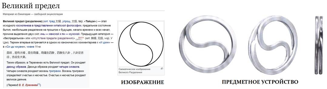 На рисунке 11, очевидна тождественность изображений плоскостного символа 太極 «Тайцзи» и устройства полезной модели скрепления плоских относительно жестких и удлинённых гибких элементов, состоящее из двух зеркально антисимметричных витков проволоки, соединённых промежуточной S-образной петлёй.
