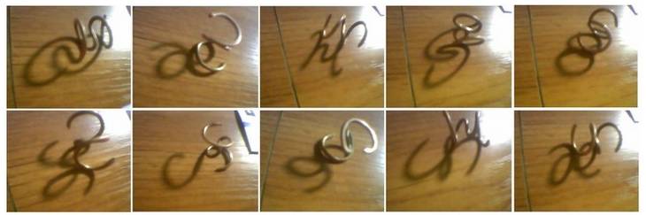 В ходе практического применения устройства, было выявлено неожиданное его свойство: при раскрытии (разжатии) его витков относительно друг друга и помещении устройства между источником света и двухмерной координатной плоскостью, на плоскости образуется проекция устройства напоминающая семантический ряд лингвистических элементов и символов (рис.12).