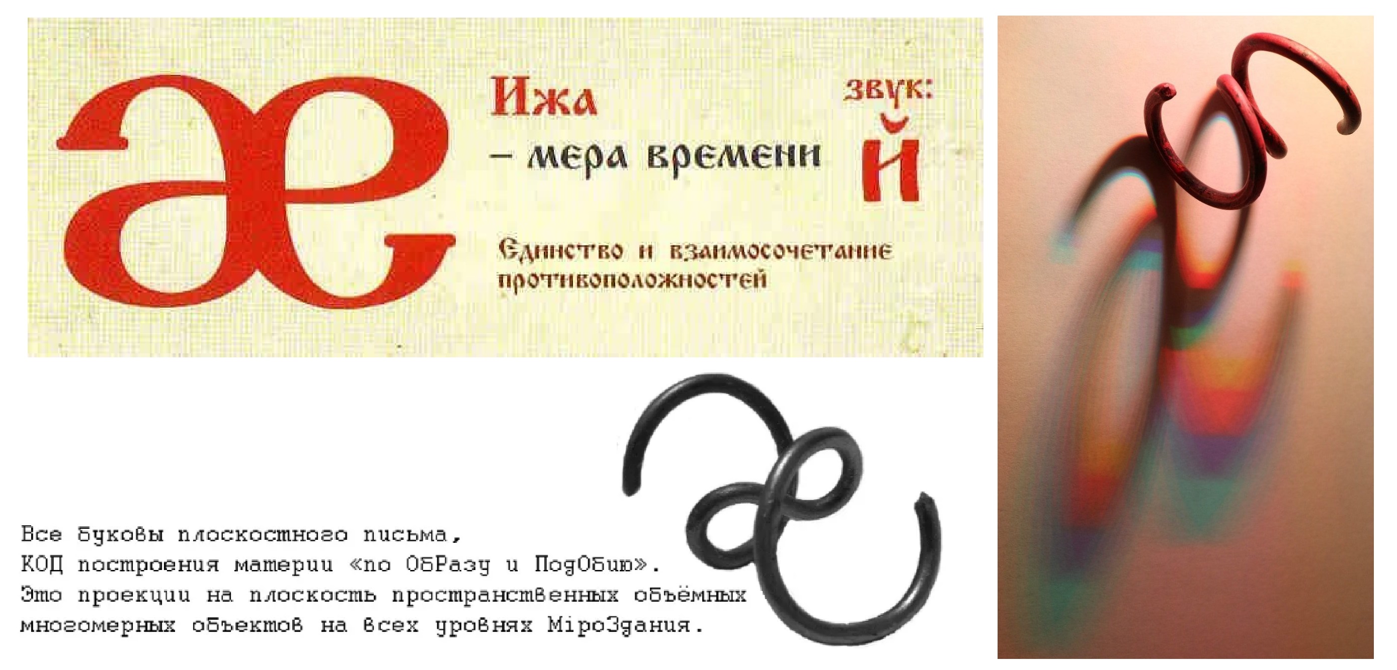 Исследование настоящего явления привело к пониманию, что все буквы плоскостного письма есть проекция на плоскости объемных многомерных объектов. Поиск тождественных символов выявил ряд лингвистических элементов из этнических языковых систем. На рисунке 14 представлен первый найденный мной лингвистический элемент и соотнесённый с языковой системой «БУКВИЦА». Элемент также используется и в других символьных системах.